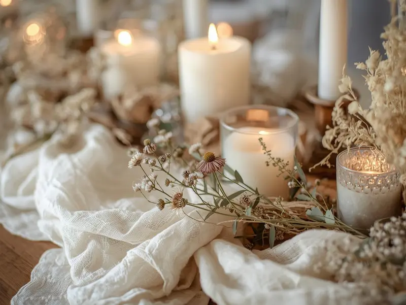 Les bougies sont un excellent moyen d’ajouter de la chaleur sans surcharge visuelle. Si vous souhaitez privilégier une approche plus responsable et personnalisée, vous pouvez vous inspirer de cette méthode pour fabriquer des bougies maison naturelles, parfaitement adaptées à une décoration mariage champêtre.