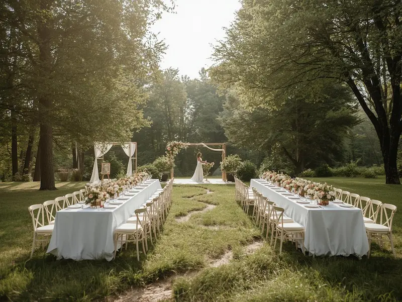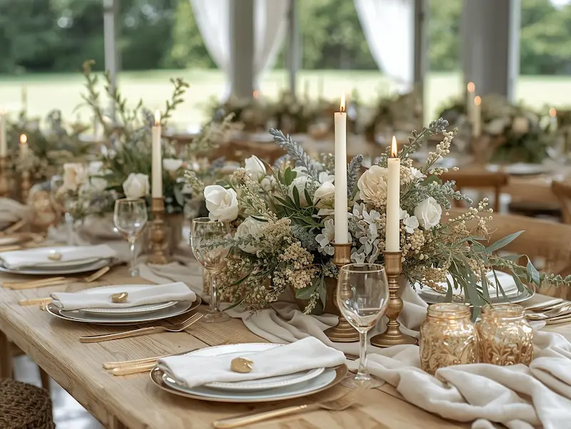 - Budget intermédiaire : location de mobilier, linge de table de qualité.