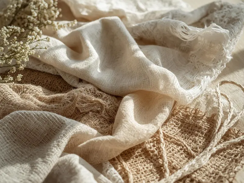 Le charme champêtre repose sur la richesse des matières. Bois brut, lin, jute et dentelle apportent un contraste tactile subtil. Ces textures dialoguent entre elles et donnent de la profondeur à la décoration, sans multiplier les objets.