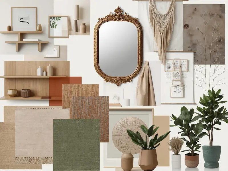Assemblage d’objets 3D, céramiques, petites étagères, paniers en rotin… ce type de composition crée une atmosphère chaleureuse et personnalisée, idéale pour les amateurs de décoration originale.