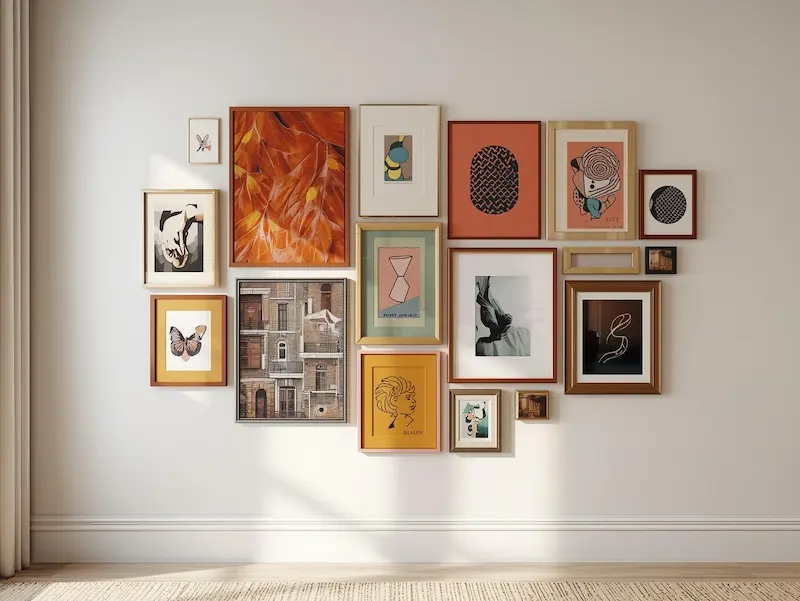 decoration murale avec cadres et objets déco dans un salon chaleureux