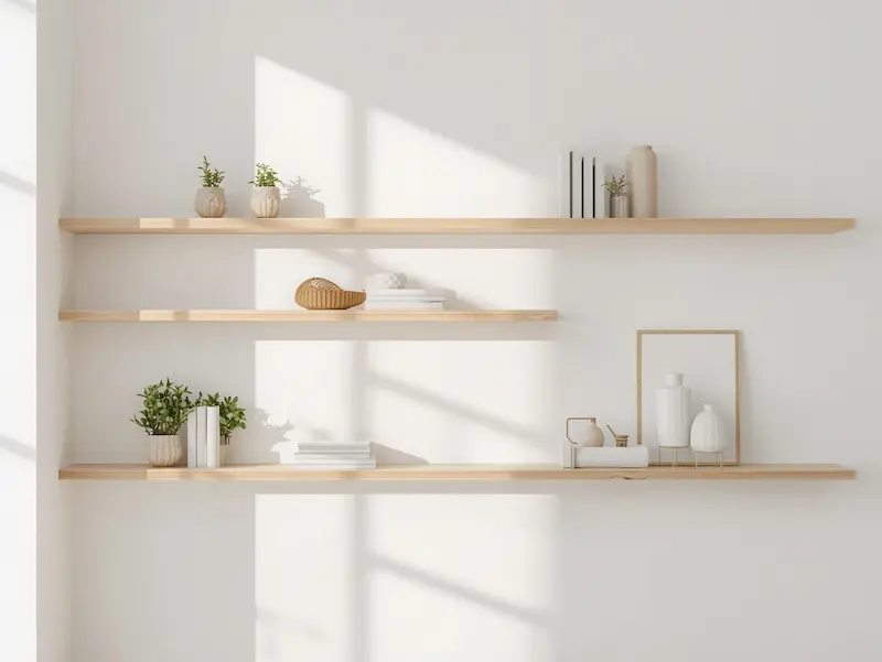 Les étagères murales sont une solution polyvalente pour structurer l’espace sans l’alourdir. Choisissez un bois clair pour renforcer une ambiance scandinave et déposer quelques objets choisis avec soin.