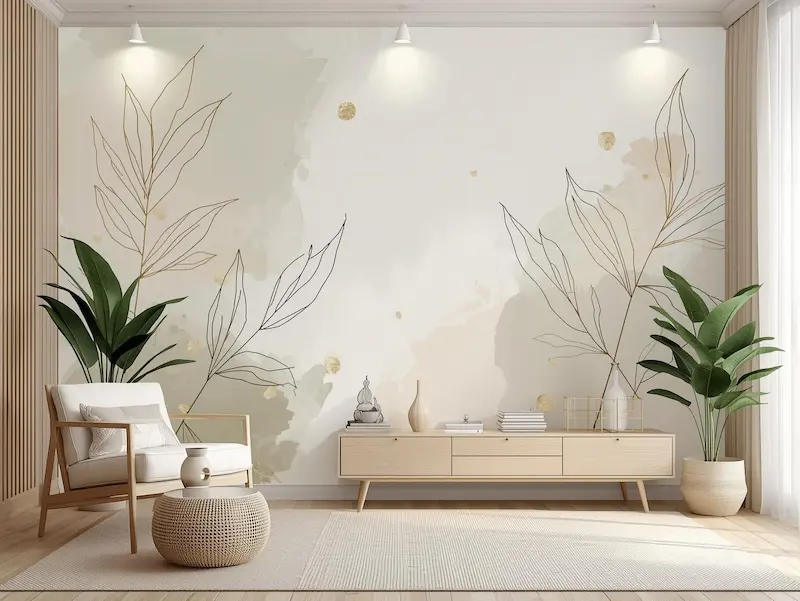 Une fresque légère, faite de lignes fines ou de motifs discrets, apporte du caractère tout en respectant un style épuré. Elle fonctionne très bien dans un salon contemporain ou un bureau.