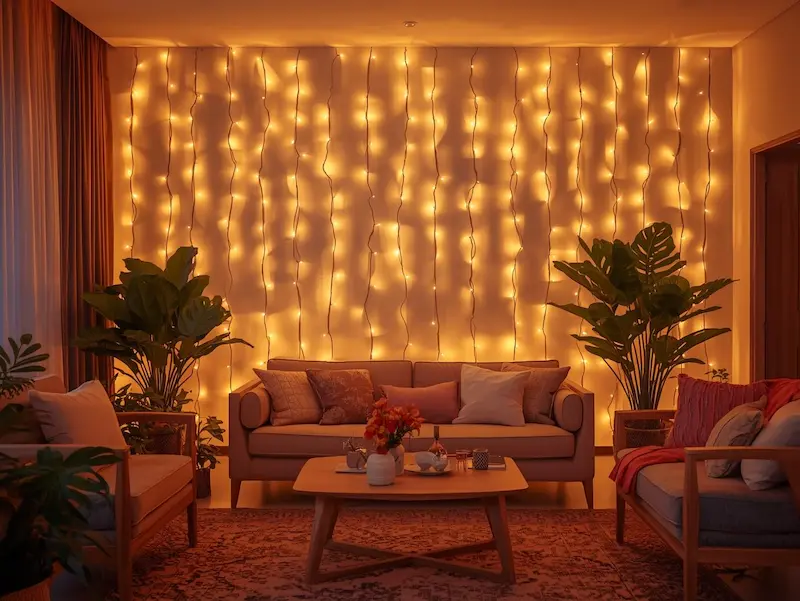 La lumière modifie entièrement la perception d’un mur. Un miroir placé face à une fenêtre agrandit une pièce et diffuse une luminosité douce. Une guirlande lumineuse crée une ambiance chaleureuse, idéale dans une chambre ou un salon cosy. Pour un rendu plus contemporain, une applique au design épuré peut structurer visuellement l’espace et mettre en valeur un tableau ou une composition murale.