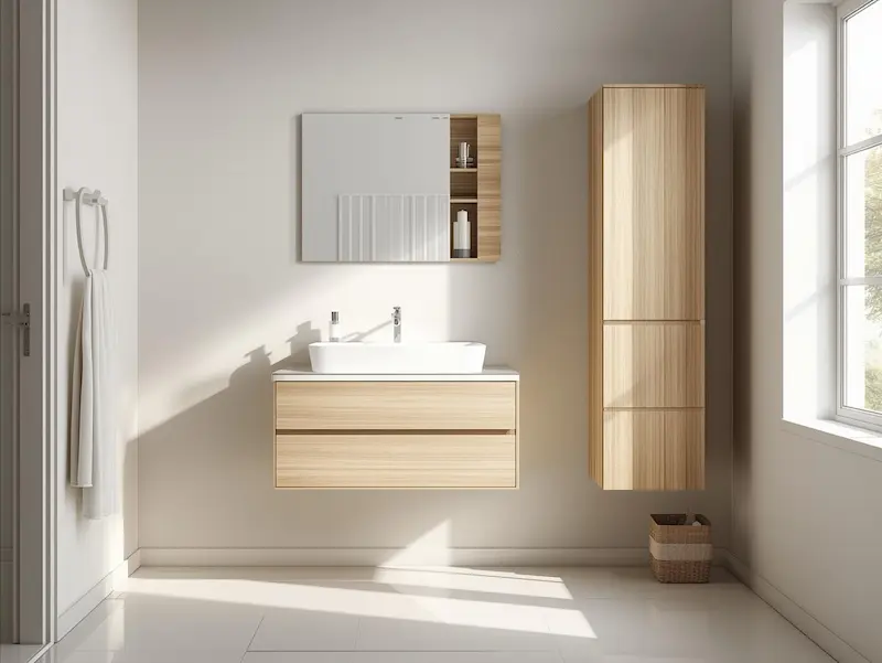 Dans une petite salle de bain, chaque centimètre compte. Le meuble salle de bain suspendu est particulièrement adapté : en libérant le sol, il donne une sensation d’espace plus ouvert et facilite le nettoyage. Les meubles à faible profondeur permettent de conserver une circulation fluide sans sacrifier le rangement essentiel.