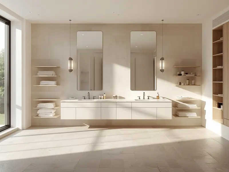 Grande salle de bainMeuble double + modules ouvertsStructure visuelle sans lourdeurUn seul meuble imposant